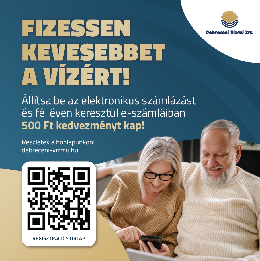 A Debreceni Vízmű Zrt. kedvezménnyel ösztönzi lakossági felhasználóit az elektronikus számlázásra való átállásra. A 2026. március 22. és szeptember 22. között zajló akció keretében a szolgáltató fél éven keresztül számlánként (legfeljebb havonta) 500 forint kedvezményt biztosít azoknak, akik az e-számla mellett döntenek.